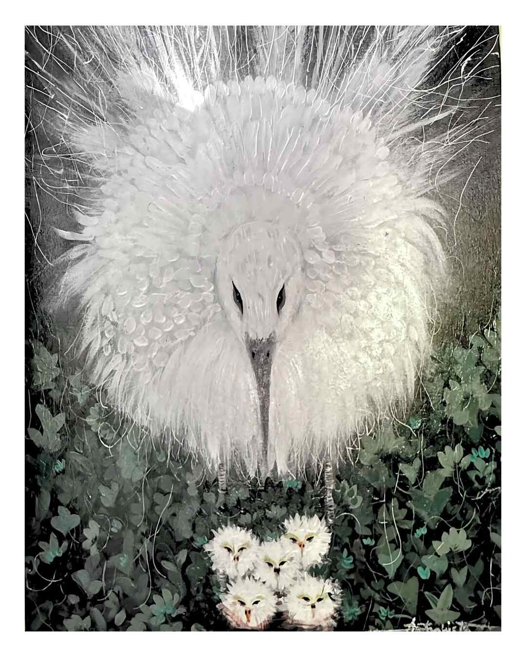 She Waits with Her Wings Open is not just a painting of a bird — it’s a portrait of devotion in its quietest, fiercest form. The Great Egret stands still, cloaked in layers of white that feel less like feathers and more like memory. Her body is curved around a softness only mothers know — the ache of protection, the weight of watching.